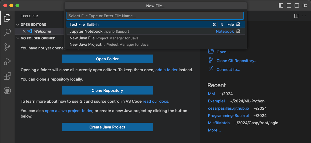 Now open VS Code, go to the menu File > New File. You will be presented with some choices is possible that you only have three options or more. In this case you need to select the Jupyter Notebook option.