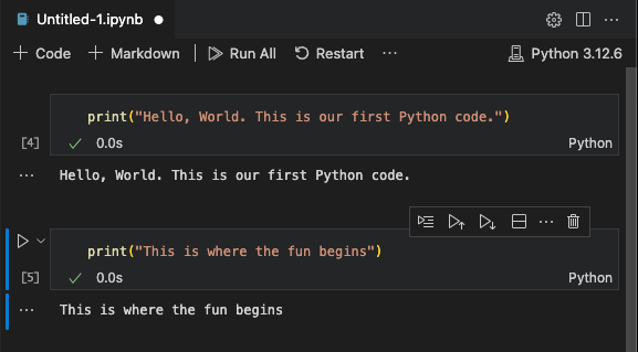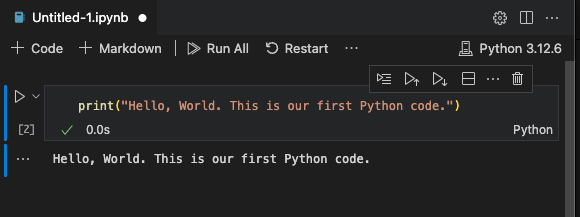 VS Code will create and open a new untitled notebook file called Untitled.ipynb (ipynb stands for “Interactive PYthon NoteBook”), which appears on the screen.